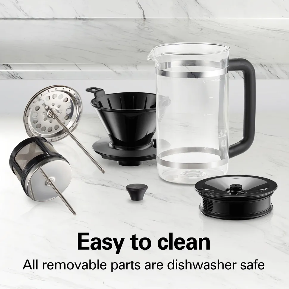 The Home Barista 7-in-1 Coffee Maker by Hamilton Beach® lets you brew coffee 7 ways with 1 compact machine. With this versatile coffee maker in your kitchen, you can replicate all your favorite coffee shop drinks at home. From 6 cups of hot, drip-brewed coffee to classic French press, this versatile coffee maker does it all.