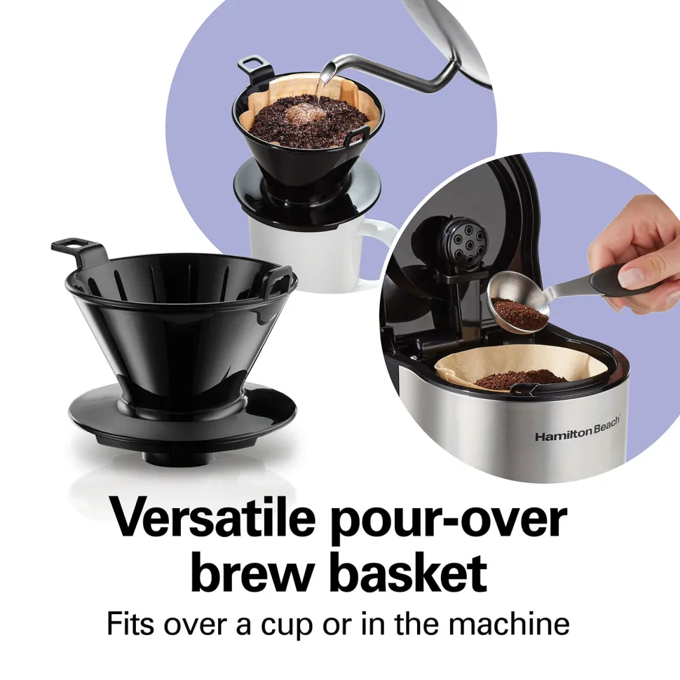 - Versatile pour-over brew basket fits over a cup or in the machine