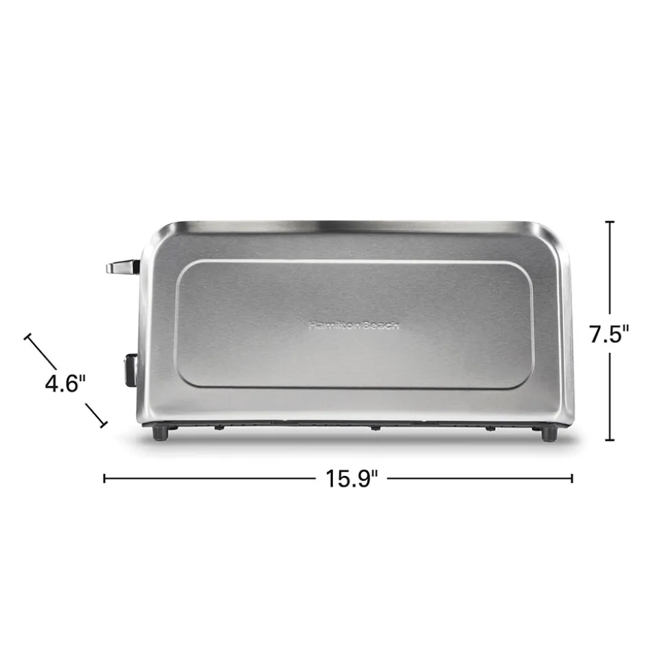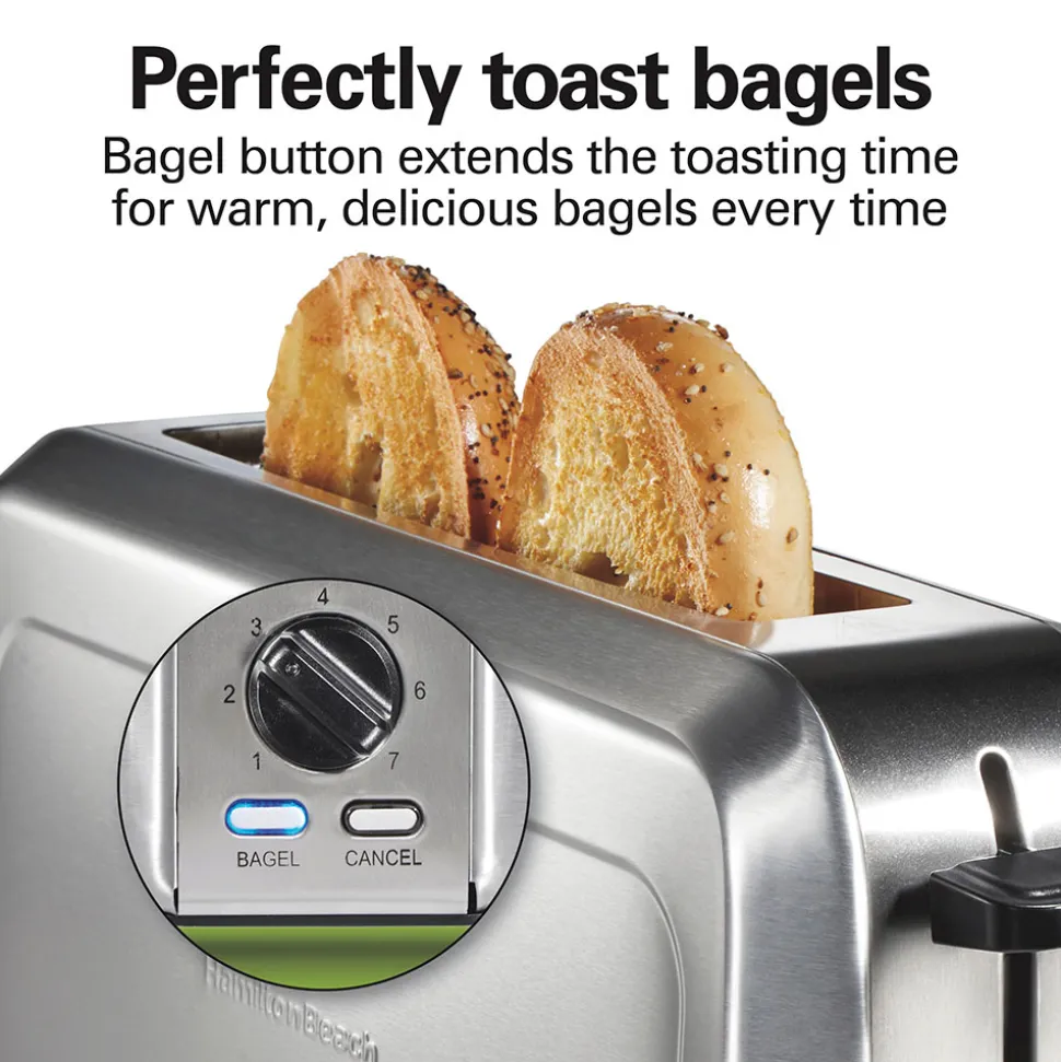 The Hamilton Beach® Long-Slot Toaster has an extra-long, extra-wide 10″ slot that fits two regular slices of bread or one long slice of artisan bread without cutting or flipping it to toast both ends. Perfect for toasting rye, sourdough, rustic, and homemade bread slices, bagels, English muffins, frozen waffles and more. The long toaster slot has self-centering bread guides to evenly brown bread on both sides, whether you’re toasting one or two slices.