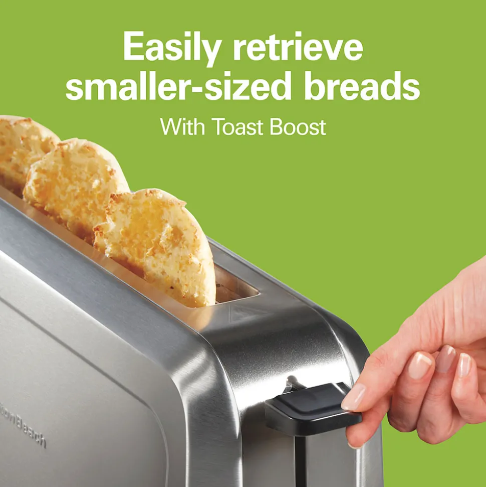 The Toast Boost feature on the stainless steel toaster lifts smaller breads like English muffins and gluten-free bread slices so they’re easier to retrieve after toasting.