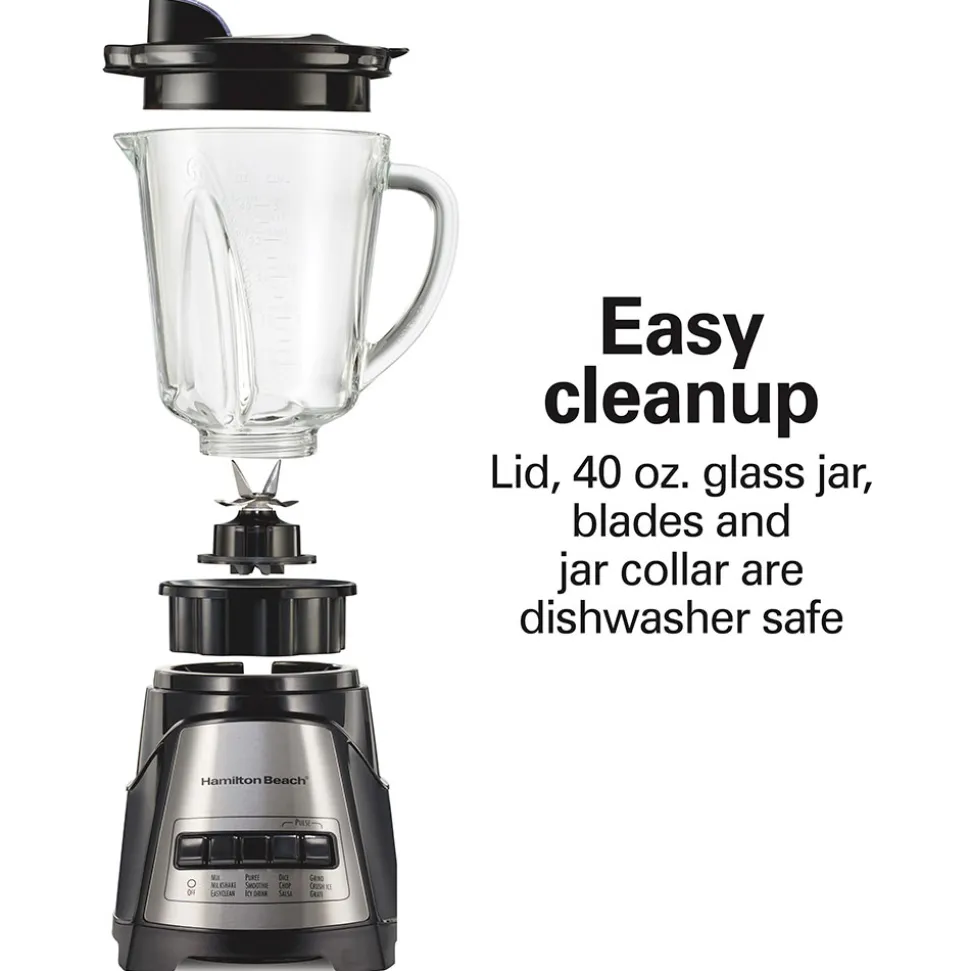 Blending multiple servings is easy with the glass jar that holds 40 ounces. The jar, lid, jar collar and removable blades are all dishwasher safe.