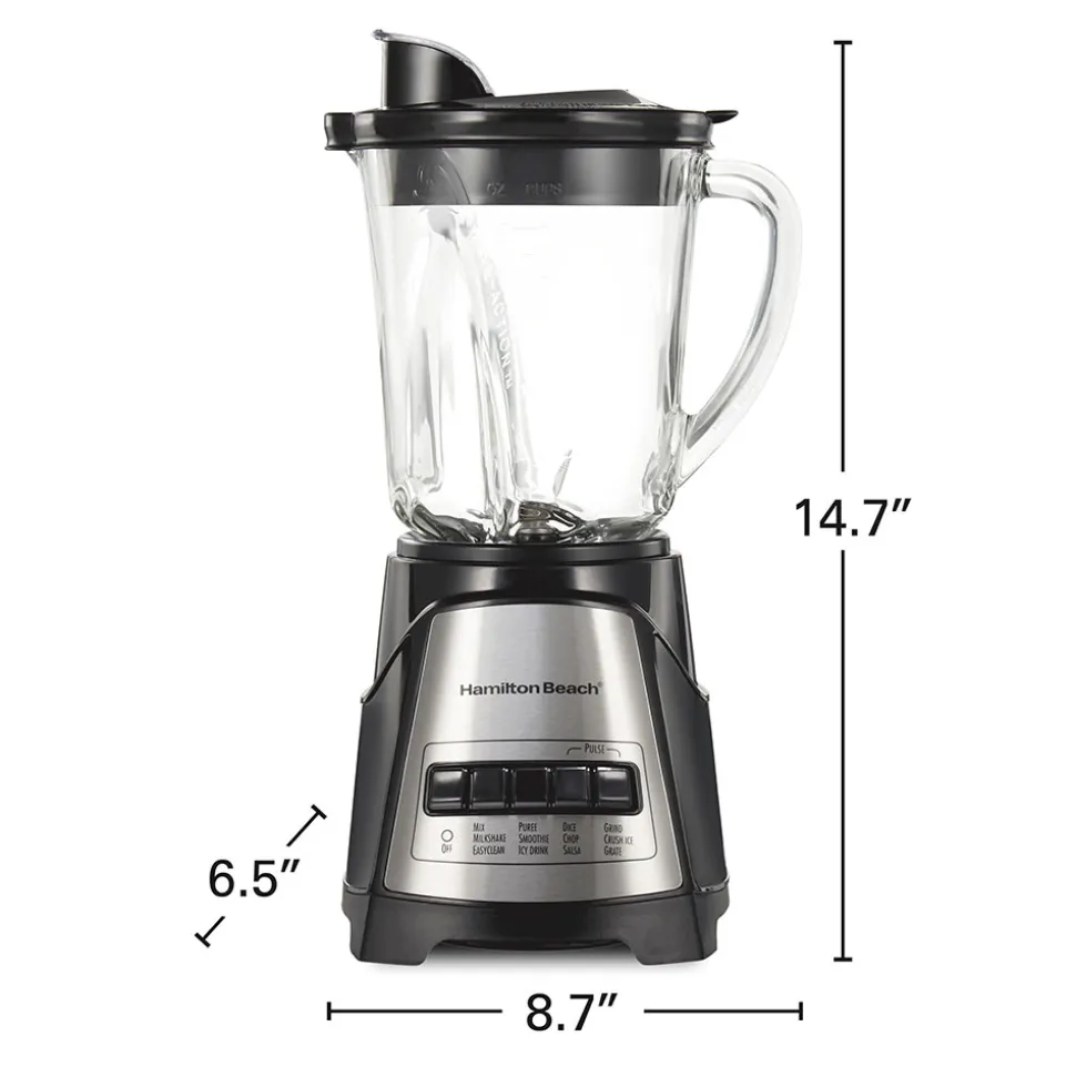 The large 40 oz. glass blending jar holds multiple servings, and the jar, blades and lid are all dishwasher safe for easy cleanup. Twelve functions controlled by 5 simple buttons give you all the versatility you need to blend, puree, dice and chop. Blend and crush ice for smoothies and milkshakes, puree vegetables and fruits, dice and chop vegetables for salsa and much more. The cord stores neatly inside the base of the blender when it’s not in use for easy storage. Built for long-lasting performance and backed by Hamilton Beach with a 3 year limited warranty.