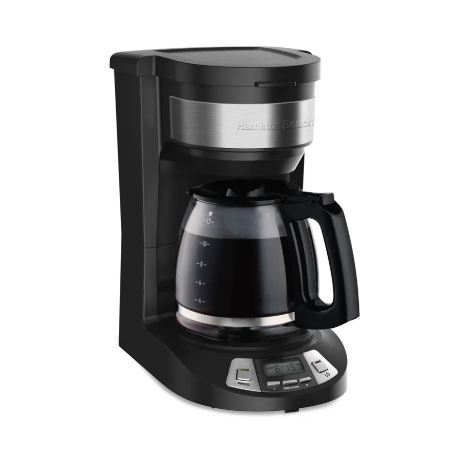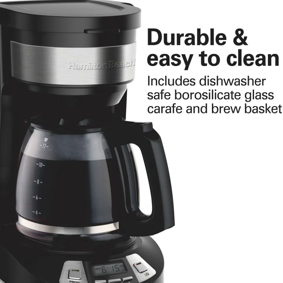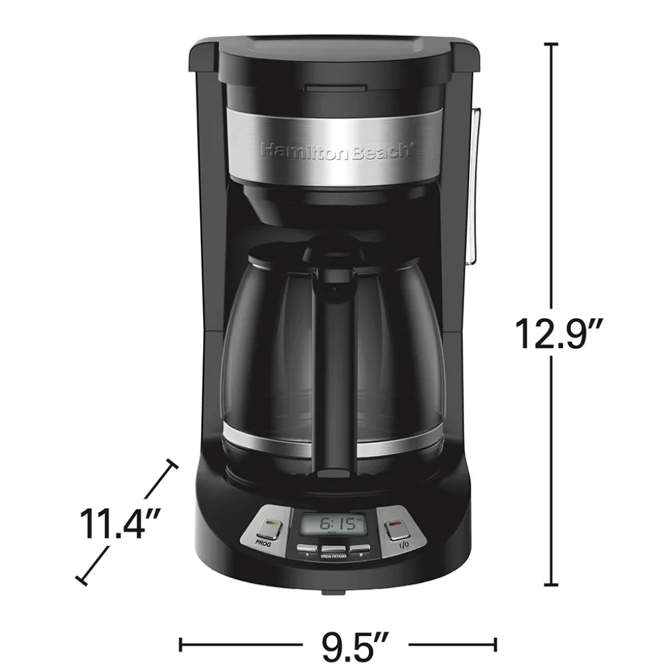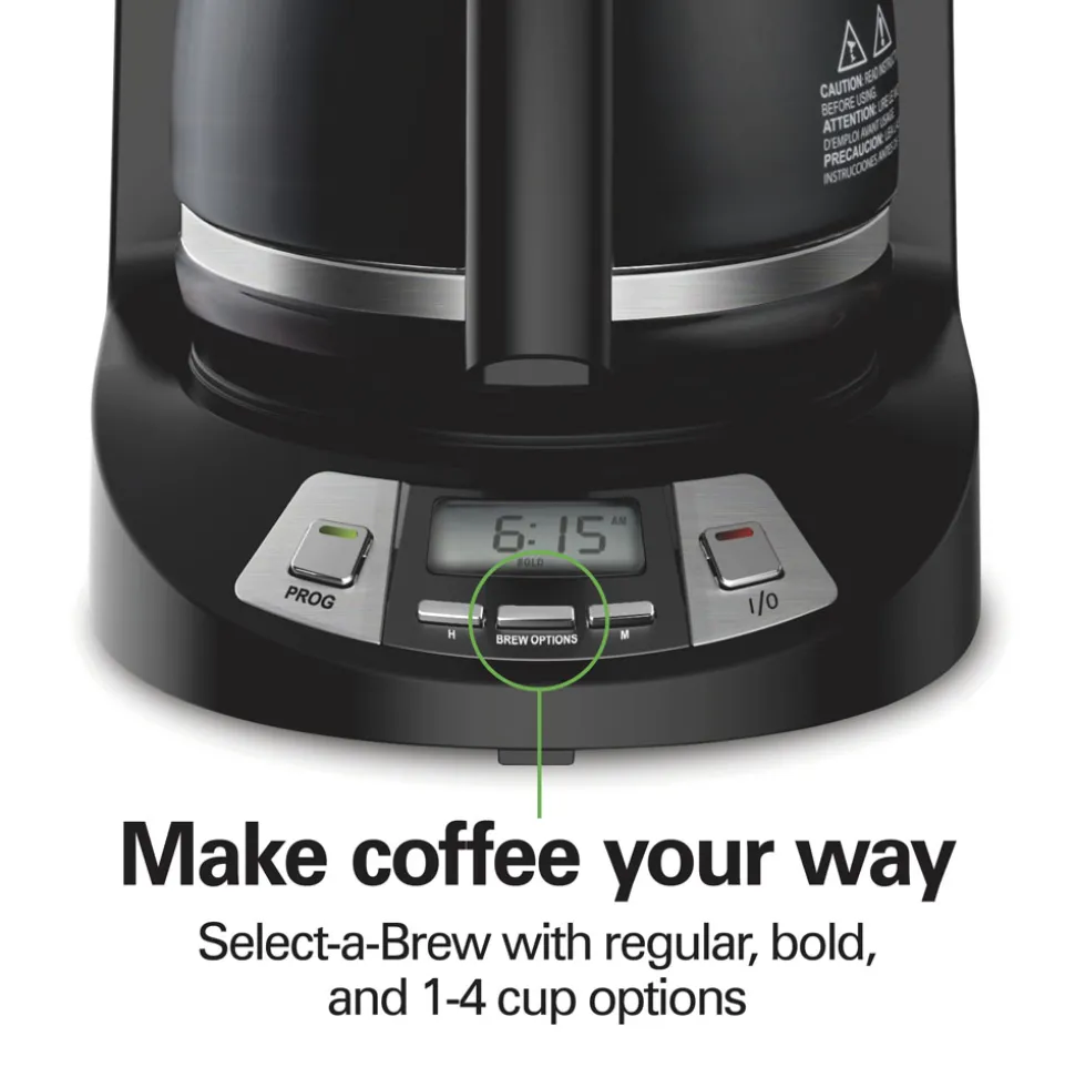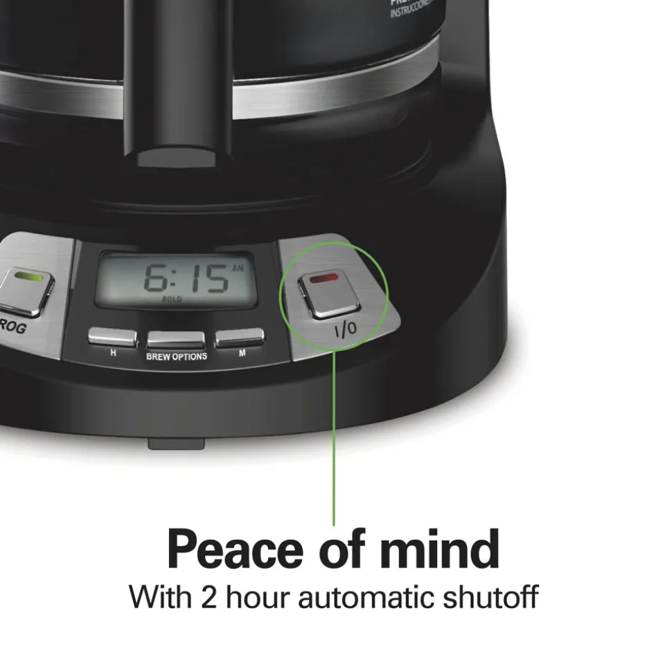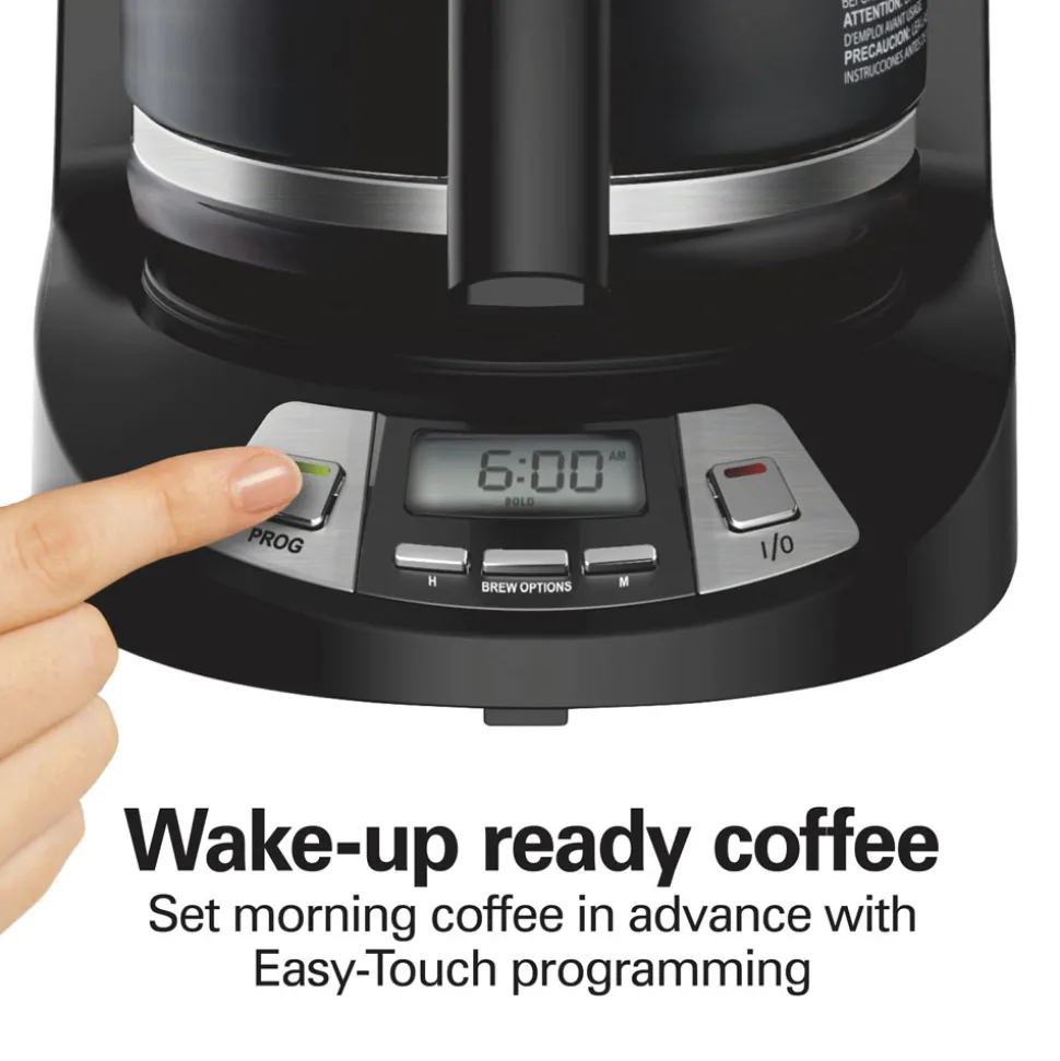Skip the alarm and wake up to the aroma of freshly brewed coffee with the Hamilton Beach® 12 Cup Programmable Coffee Maker. It can be programmed up to 24 hours in advance so you wake up to a fresh pot of coffee every morning. The coffee maker is easy to program, and it automatically shuts off after 2 hours for peace of mind. Customize your cup with three brew options — regular, bold, or 1-4 cups for optimal flavor when brewing less coffee.