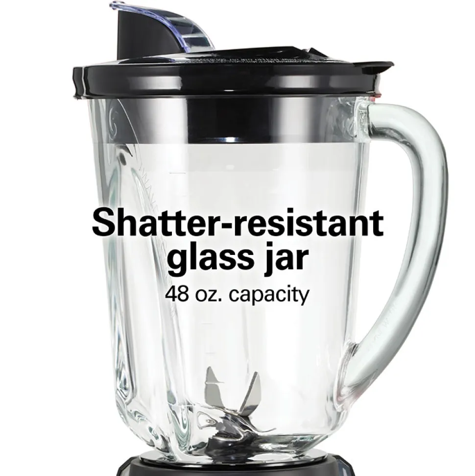 The durable glass jar withstands temperatures from icy drinks to hot soups. Blending multiple servings is easy since it holds 48 ounces, and the lid has a flip-up opening to let you add ingredients while blending.