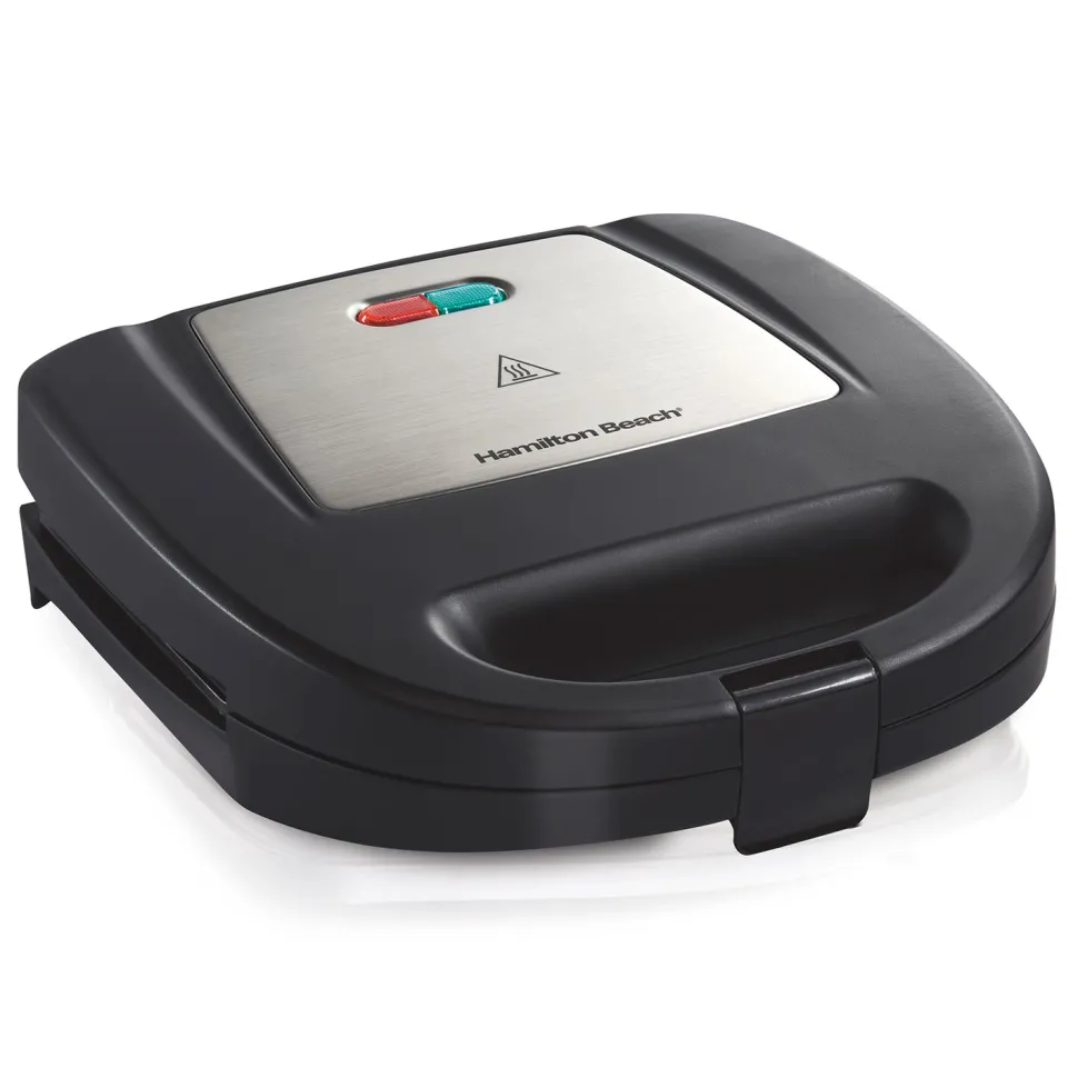 Enjoy hot and delicious grilled sandwiches at home with the Hamilton Beach® Panini Press Gourmet Sandwich Maker. It will evenly grill sandwiches of almost any thickness thanks to a floating café-style lid. Using fresh ingredients, you can make everything from open-faced sandwiches to basic grilled cheese, thick reubens, personal pizzas, fruit turnovers, or bruschetta. The large cooking surface can accommodate up to 2-3 sandwiches at once. Power and preheat lights let you know when it is ready, and the sandwich is easy to remove from the nonstick grill plates. Save valuable cabinet space and store it upright in between use.
