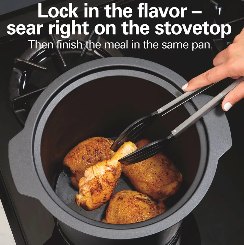 Enjoy great flavor along with one-pan convenience: sear on the stovetop, then finish the meal in the same pan. The removable nonstick pot can cook directly on gas, electric or ceramic stovetops.