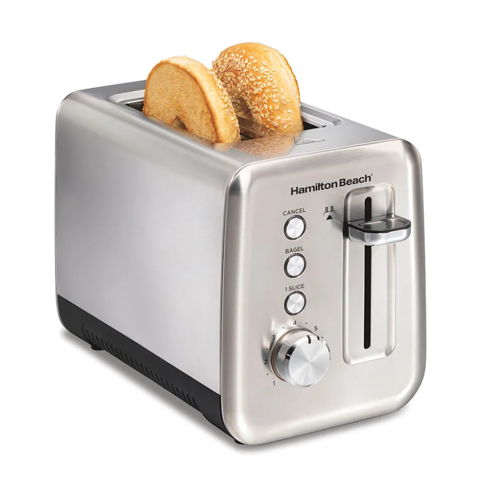 Not only does the Hamilton Beach® Sleek Stainless Steel 2 Slice Toaster have a modern, upscale look, it’s designed with Sure-Toast™ technology to ensure your toast has balanced color and texture on both sides of bread, even when toasting a single slice. Simply push the 1 Slice button. The toaster has 2 wide slots to easily toast a variety of breads, from bagels and thick-sliced artisan breads to English muffins and waffles. Bread guides hold each slice upright and centered within the slot, so bread is evenly warmed and toasted by the heating elements.