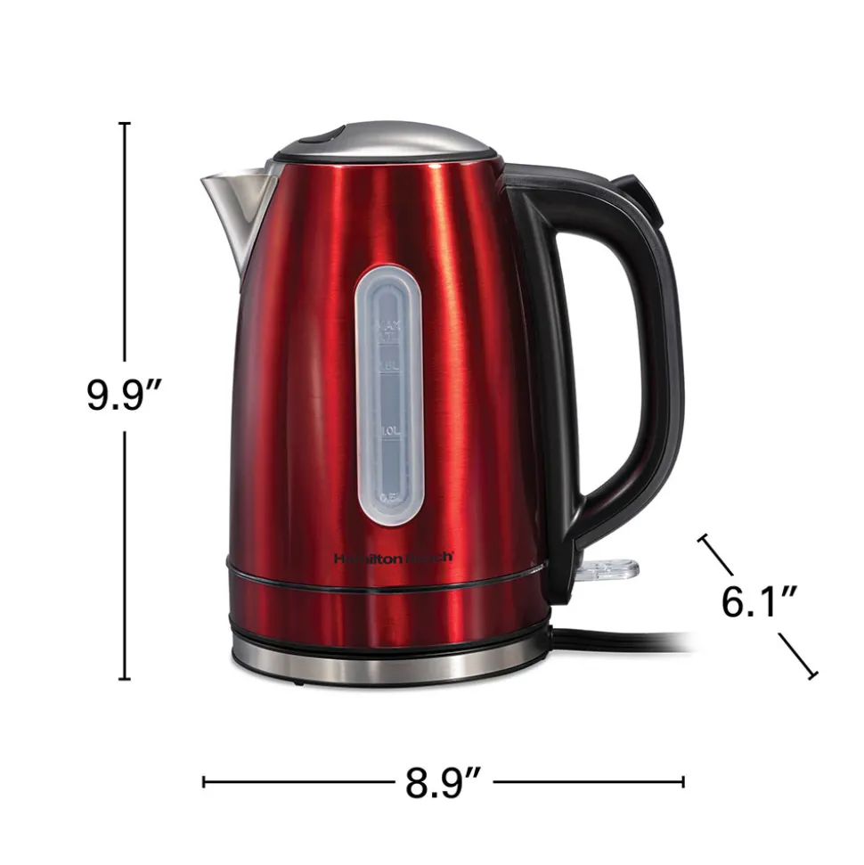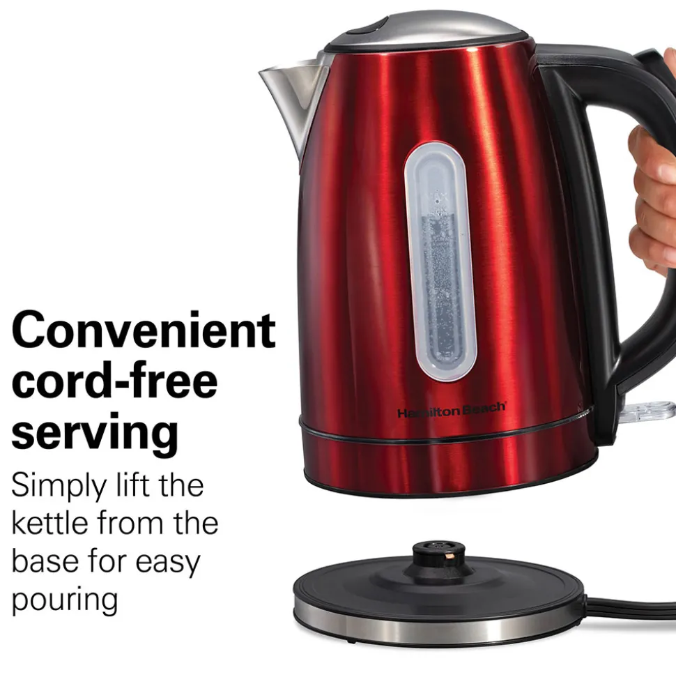 For peace of mind, this attractive red kettle comes equipped with automatic shutoff and boil-dry protection. You can boil water quickly every time since the kettle provides 20% faster boiling than a microwave.* The easy-to-view water window lets you effortlessly monitor the kettle’s water level, and convenient cord-free serving makes it easy to pour beverages at the table. Includes a removable mesh filter that helps prevent mineral scale from getting in your cup.