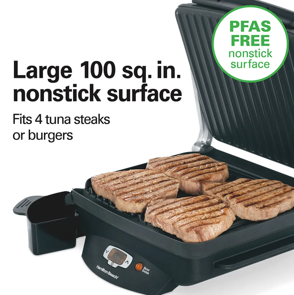 - Large 100 sq. in. nonstick surface fits 4 tuna steaks or burgers