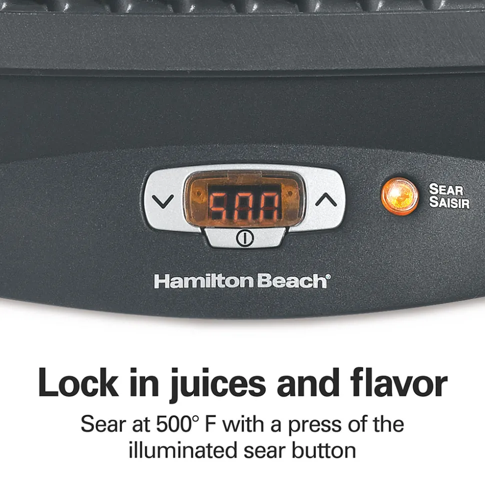 With the Hamilton Beach® Steak Lover’s Indoor Grill, there’s no need to fire up an outdoor grill to get great grilled flavor. It features a high searing temperature of 500°F that locks in juices and flavor and makes everything you sear — steaks, burgers, fish, chicken and pork chops — taste delicious. Best of all, food won’t stick to the grilling plate since it has a nonstick coating. This grill has an illuminated sear button to make searing easy. Just press the button, and the grill sears at 500°F (260°C) then switches to your selected grilling temperature.