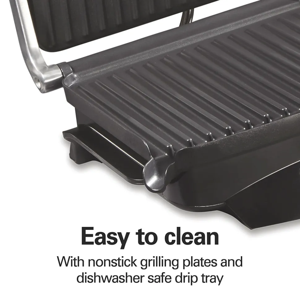 The 100 sq. in. nonstick cooking surface on the indoor electric grill has plenty of space for cooking a variety of meats, veggies or panini sandwiches.