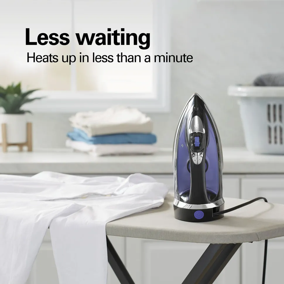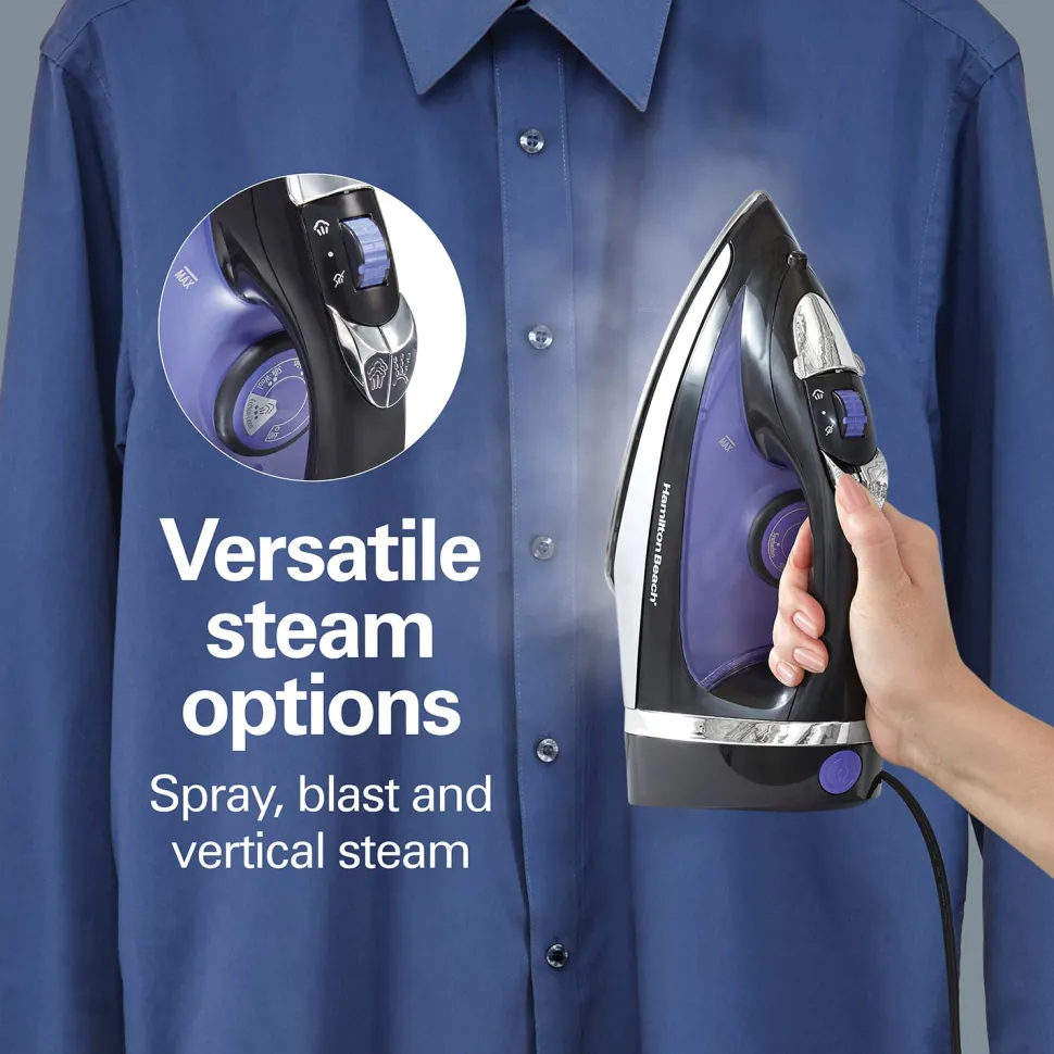 You’ll reach for the Hamilton Beach® Steam Iron with Retractable Cord every time you need to remove wrinkles fast. The durable stainless steel soleplate glides smoothly over fabrics to quickly press out wrinkles and provides long-lasting performance. After ironing, the 8 foot cord quickly retracts into the base for easy storage. You’ll enjoy less waiting before ironing because the iron heats up in less than a minute.